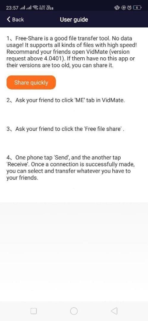 In a way to share files through VidMate File Share, your friend needs to update his VidMate to the latest Version or above because this is the version that received this sharing feature and lot more. It’s completely free from any data usage and irritating advertisements. Kudos to VidMate developers for this feature